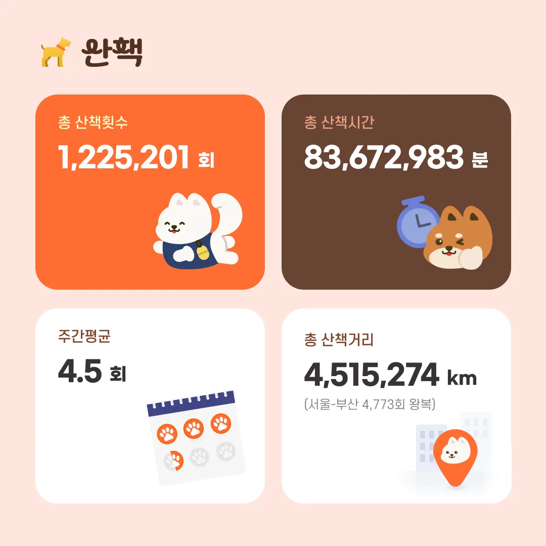 올해 우리 펫피 가족들은 무려 1,225,201번의 산책을 즐기셨어요! 총 산책 시간은 약 83,672,983분, 거리로는 4,515,273km를 걸으셨습니다. 서울-부산 왕복으로 무려 4,773회! 지구를 112바퀴나 돈 셈이에요! 그리고 산책을 매주 4.5회씩 꾸준히 하신다니 역시 펫피러들은 대단대단!