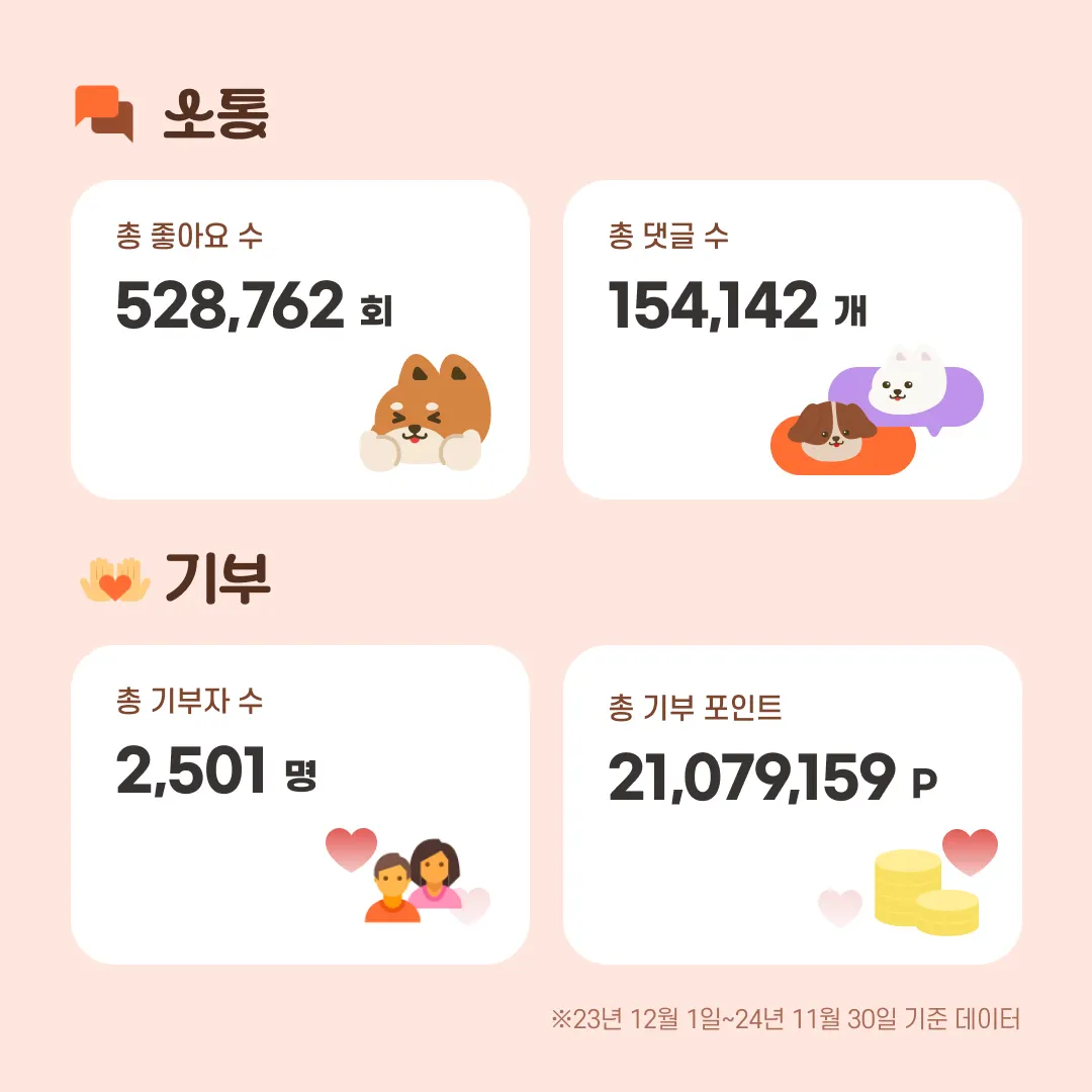 2,501명의 멋진 기부천사들 덕분에 총 21,079,159 포인트의 기부가 이루어졌어요. 여러분의 작은 관심과 사랑이 모여 큰 변화를 만들어냈습니다. 여러분들의 소중한 마음을 모아 펫생각과 함께 익산시 유기견 보호소에 매달 꾸준히 기부를 진행하고 있어요.