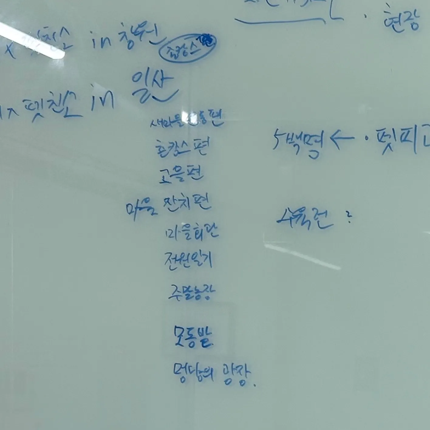 저희는 매일 이렇게 1시간에서 1시간 반정도 오전에 정기적으로 회의를 하는데요! 여기서 저희 실장님과 매니저분들의 무궁무진한 아이디어와 자료들이 쏟아져 나옵니다